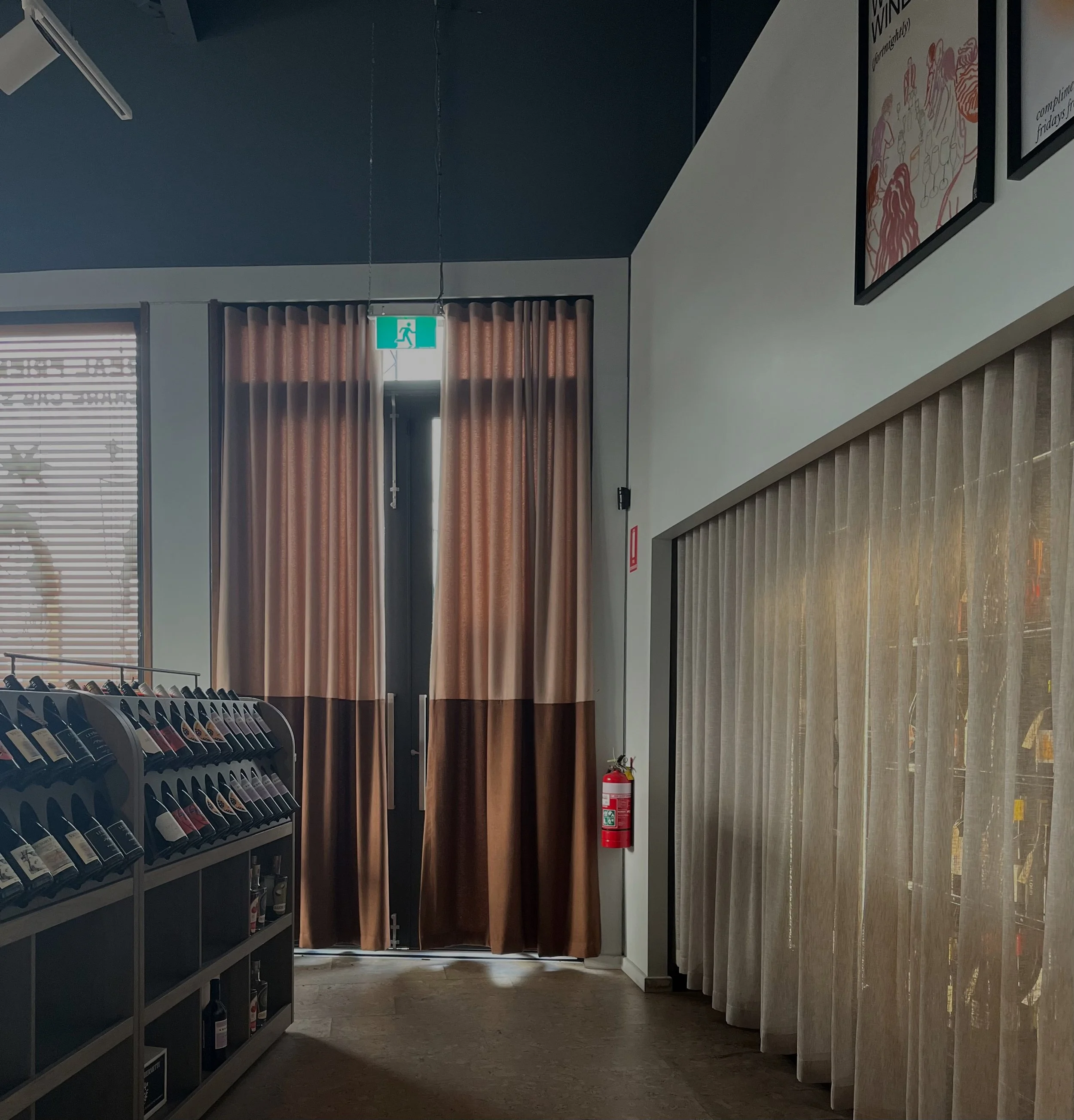 Timber venetian blinds add warmth, two-tone curtains add vibrancy & simple neutral sheers offer softness while creating a functional partition.